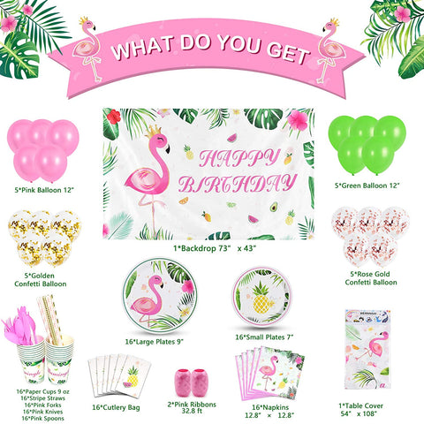 🌴 PARTY IN A BOX - Literally everything you need for a party of 16 people.The package includes 168 pieces party accessories: birthday backdrop, table cover, cups, plates, balloons, ribbons, forks, knives, spoons, straws, cutlery bags, napkins.